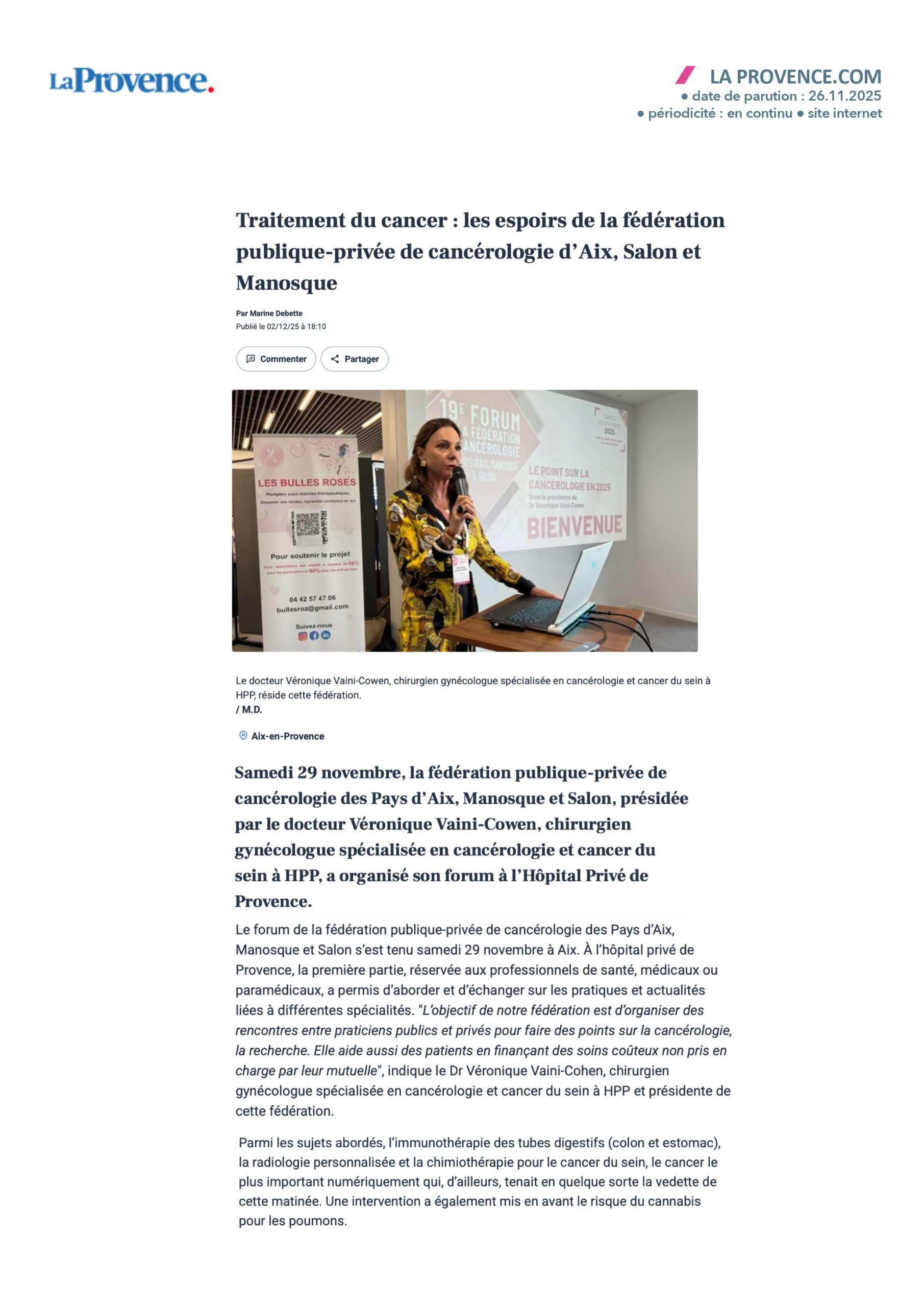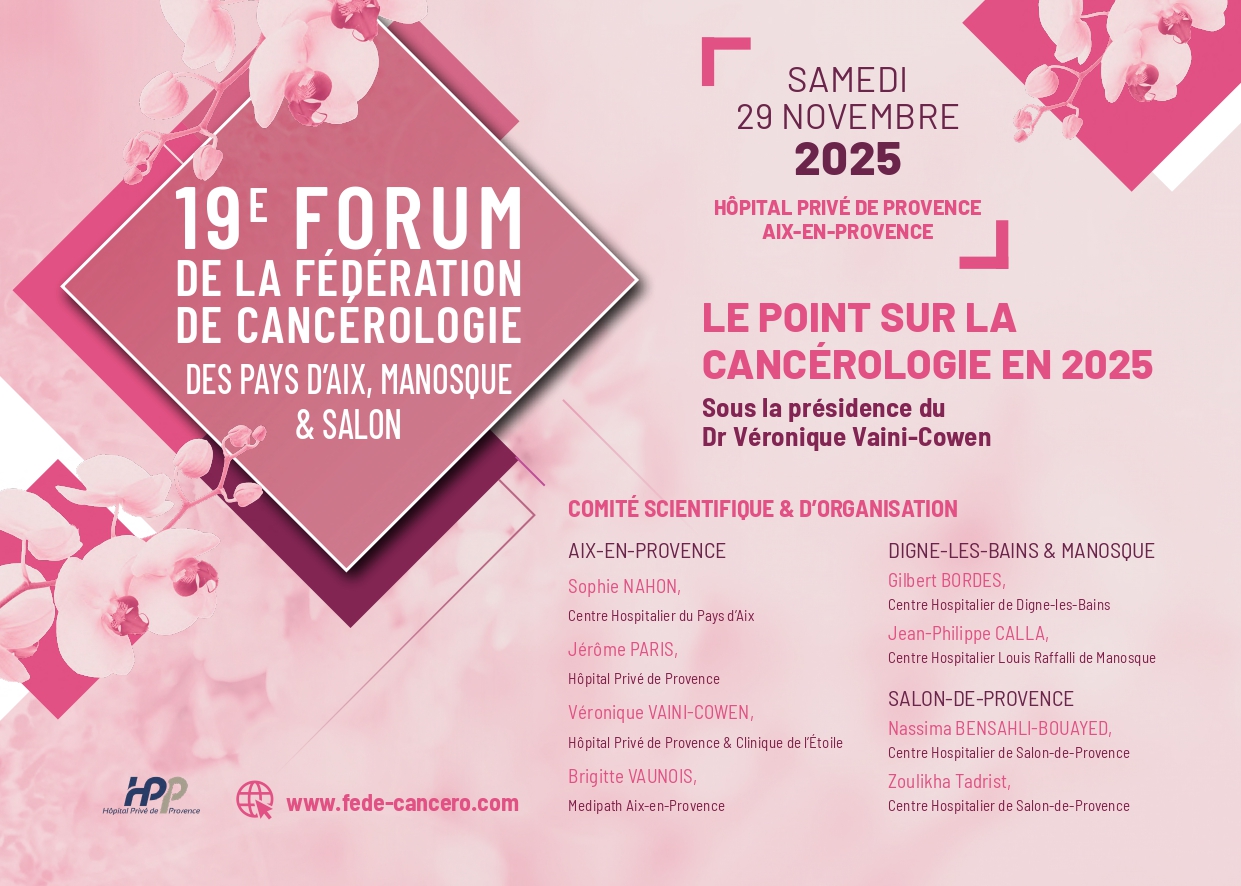 En novembre 2017, j’ai eu l’honneur de devenir présidente de la Fédération de Cancérologie du Pays d’Aix, Manosque et Salon. Je participe ainsi activement à l’information et au développement des nouvelles techniques et traitements afin de vous offrir les options les plus modernes et adaptées à vos besoins et promouvoir, aux côtés d’une formidable équipe, des soins bienveillants et accessibles.