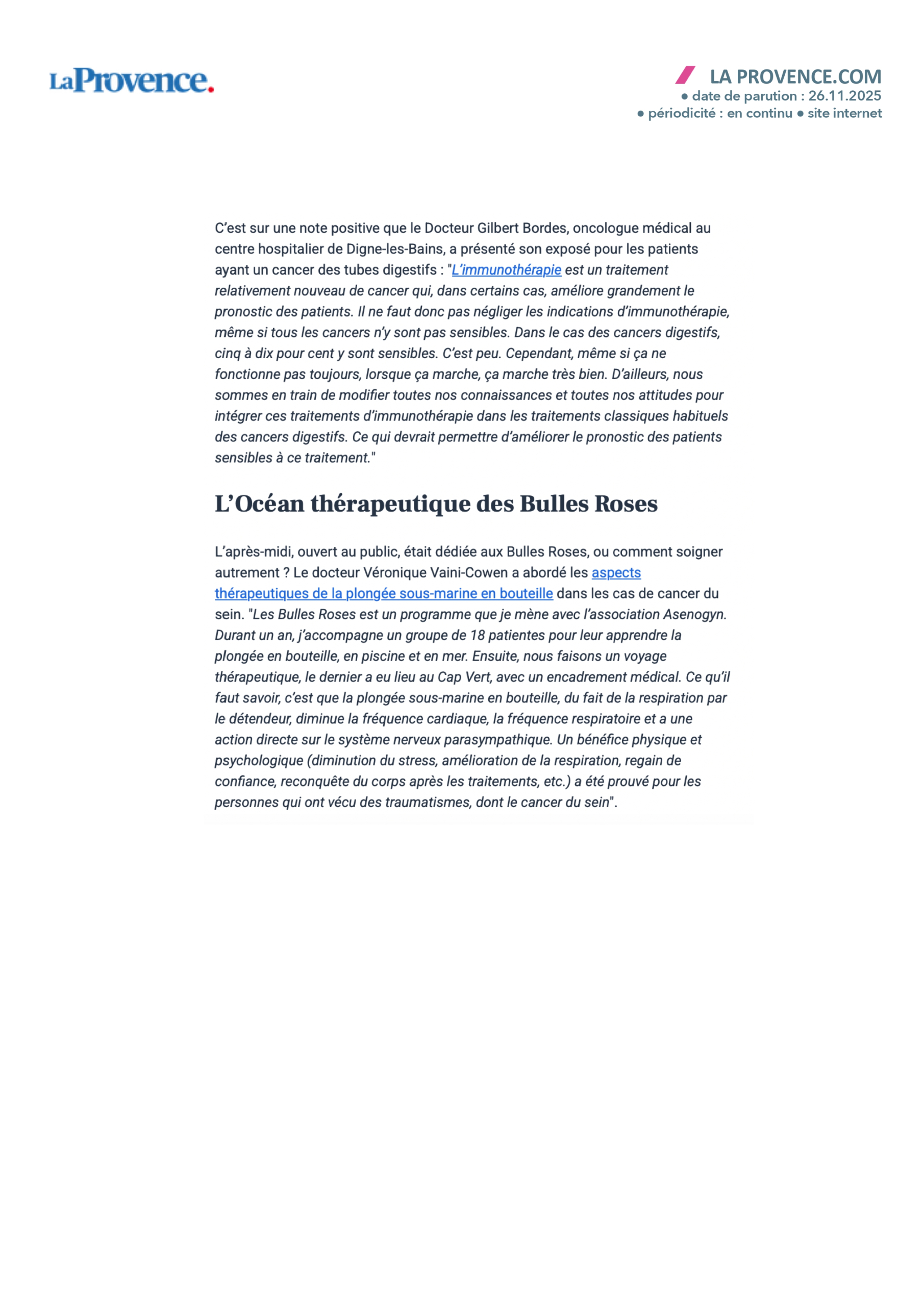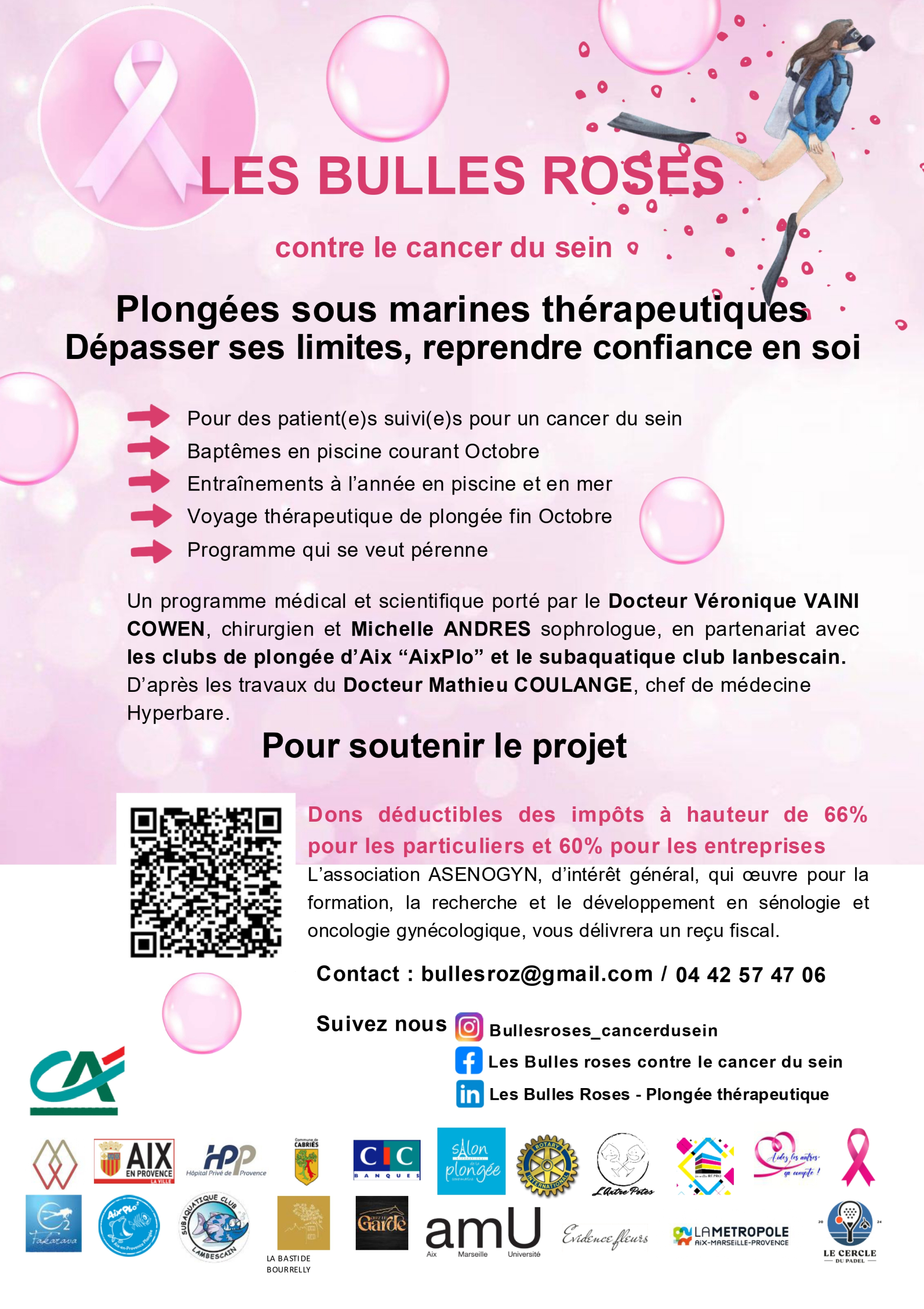 Si je privilégie la chirurgie sous l’hypnose et l’utilisation des dernières innovations chirurgicales pour que mes patientes soient opérées de la façon la plus douce et la moins invasive possible, c’est parce que je veux leur offrir une prise en charge qui va au-delà de la simple opération chirurgicale. J’ai appris que les méthodes dites non conventionnelles faisaient partie intégrante de la guérison. À cet effet et à l’occasion d’octobre rose, j’ai mis en place des programmes pour le bien-être des femmes opérées. Le dîner des chefs, initié en 2015, leur permet de déguster le jour de leur opération un repas gastronomique. Les bulles roses contre le cancer du sein est un programme de plongées thérapeutiques proposé depuis octobre 2024 à des patientes opérées d’un cancer du sein, inspiré des travaux scientifiques du Docteur Mathieu Coulange qui ont montré les bienfaits de la plongée sur la santé psychique.